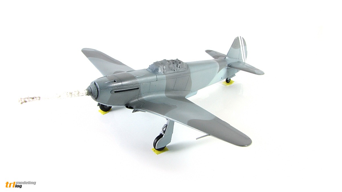 Spinner was painted red with a white border, and cannon barrel from the injection needle (of a larger diameter than the machine guns of course) was installed. Propeller blades, painted black, got decals and some battering (silver paint applied with a bit of sponge). That altogether was installed in the model and weathered, especially the fuselage just behind the spinner.