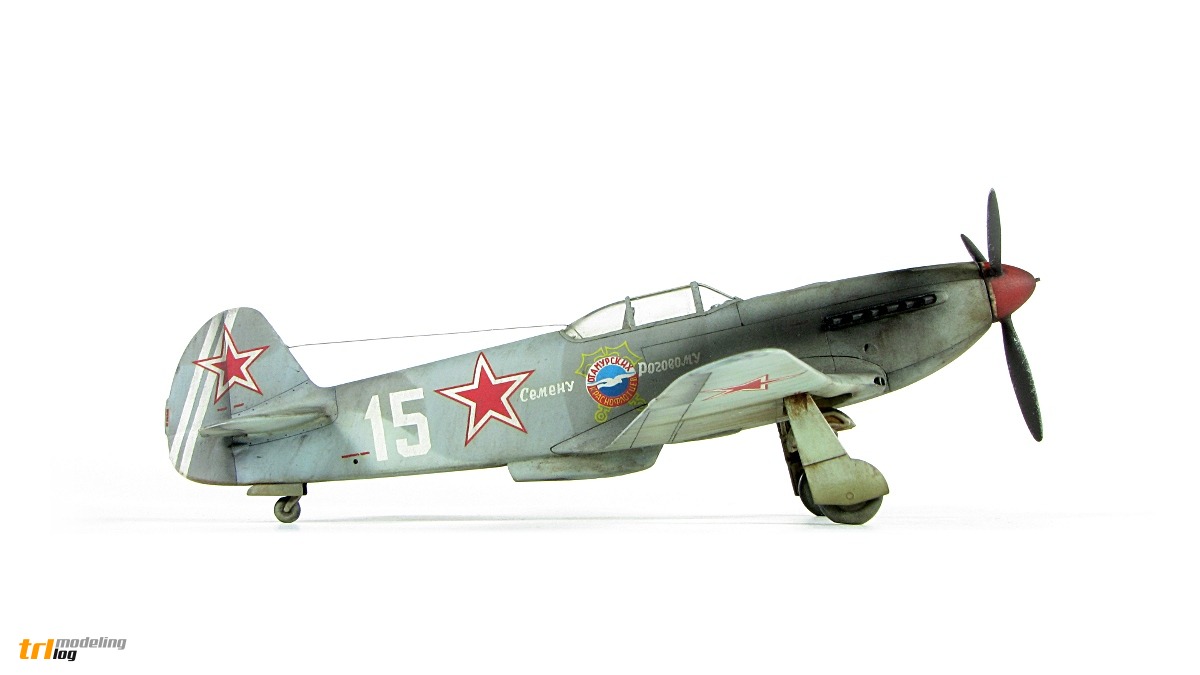 Miniature depicts Yak-3 of Lieutenant Semyon Ivanovich Rogovoy from 64th Guards Fighter Regiment, 4th Guards Fighter Division. Second Baltic Front, autumn 1944. Red spinner and white (or yellow, colour is uncertain) rudder stripes were 64th GIAP unit markings in that time. Inscription on the fuselage means: "To Semyon Rogovoy from members of the Amursk Red Flotilla". Apparently, the plane was dedicated to Semyon Ivanovich for his role in saving one of the flotilla's vessel.