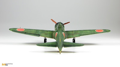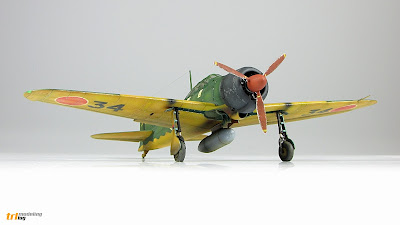 Aircraft depicted on eye-catching boxart didn't belong to 201st Kokutai as Airfix claims. It was used by Tsukuba Kokutai Operational Training Unit. There is a good quality war-time photograph of this particular machine, which indicates some inconsistencies in proposed camouflage. For example Hinomaru at the bottom of the wing is clearly seen with white border. This also indicates, that lower surfaces of this fighter were most probably in orange-yellow colour, not standard gray. Quite more interesting camouflage, if you ask me.