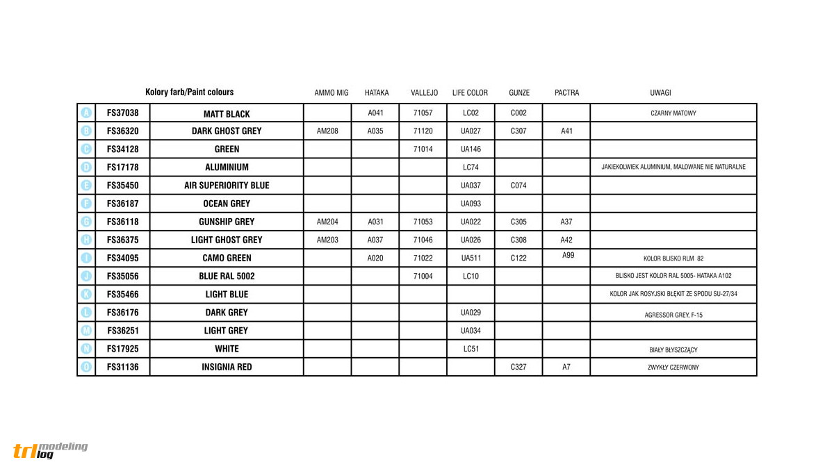 Each of the schemes is presented in instruction on 4-way color profiles with decals arrangement showed. Recommended colors are given only as a FS numbers, which is a little disappointing. However you can find extended color table on Arma Hobby blog (link), where was published by one of the brand creators.